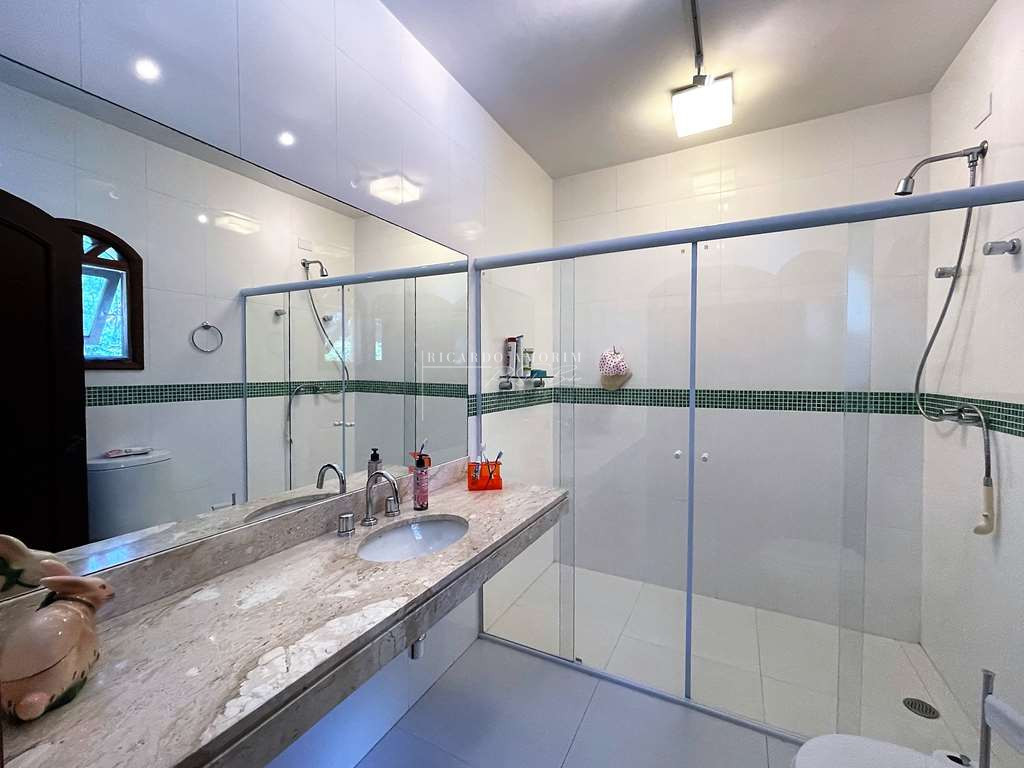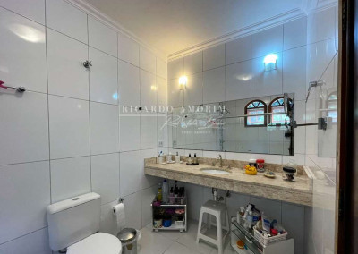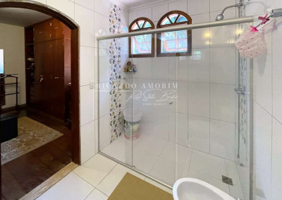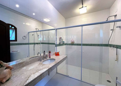 - Banheiros com espelho e box de vidro, sendo a máster com bancada em Travertino.
