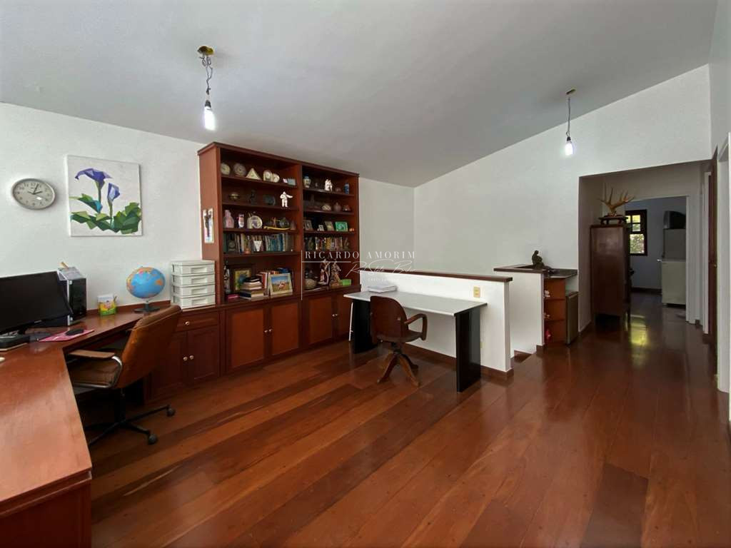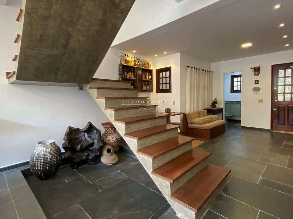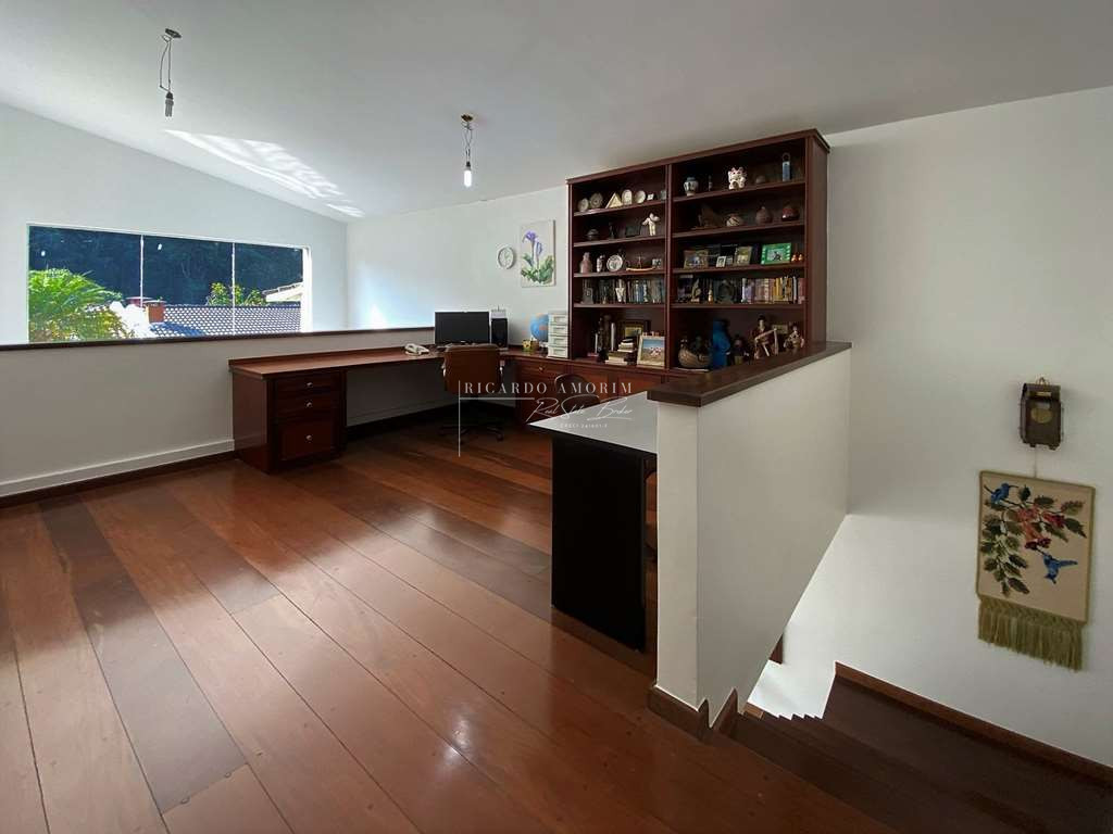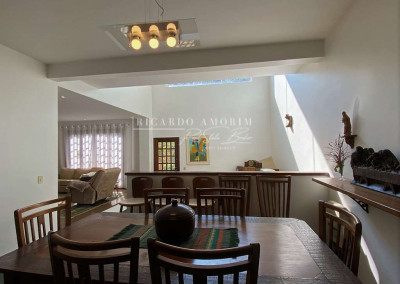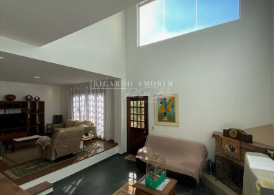 - Salas de estar, TV, jantar, bar e lareira em desnível com pé direito alto.