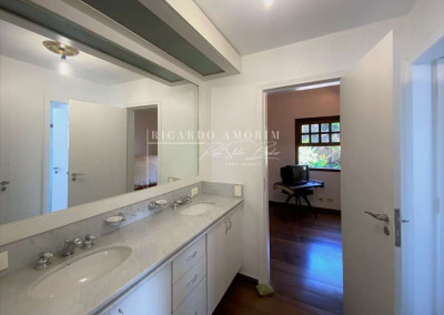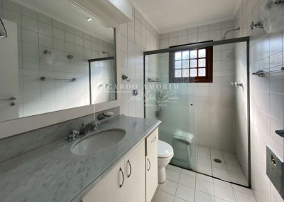 - Banheiros com bancadas em mármore Carrara, espelho, gabinetes, box de vidro e ducha higiênica. As 2 suítes americanas com lavatório externo e 2 cubas.