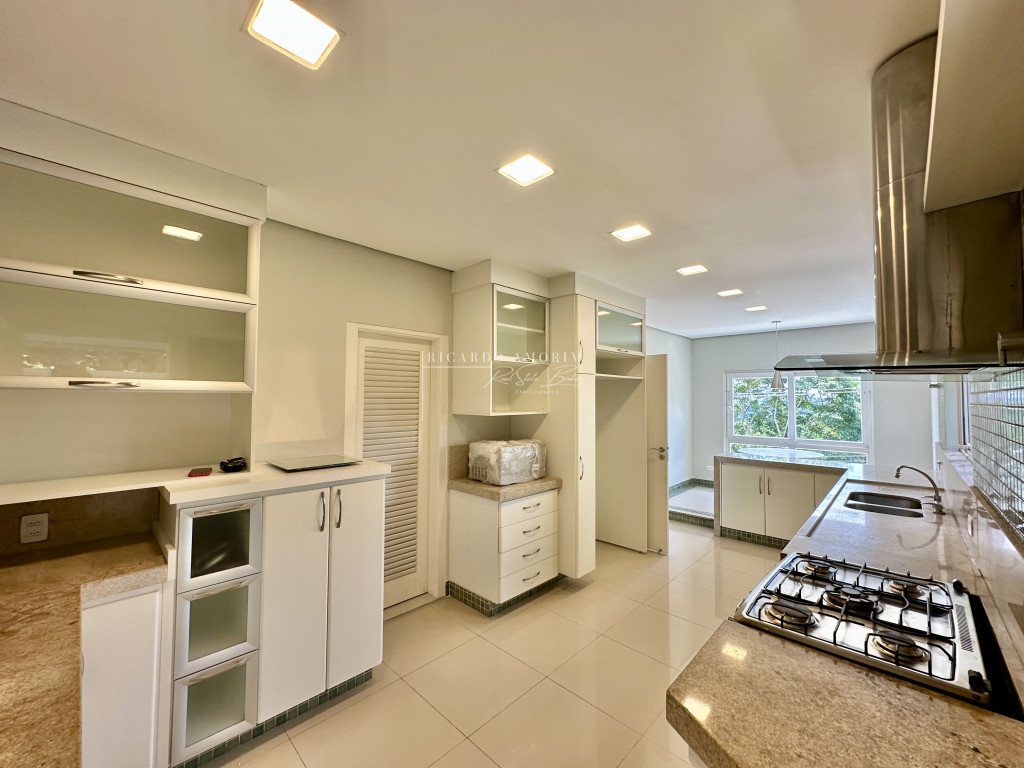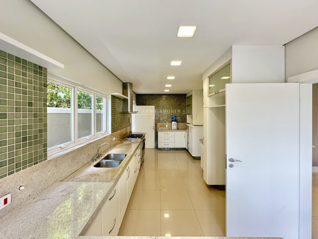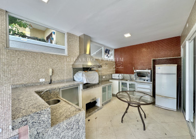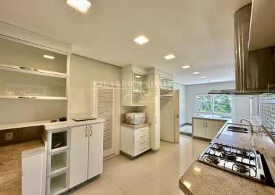 - Copa cozinha ampla, repleta de armarios planejados integrada à sala de jantar, sala de almoço e café da manhã com vista panorâmica. Bancadas e balcão em granito, com pia dupla inox, coifa, espaço para fogão de 6 bocas, geladeira duplex e despensa com prateleiras em granito