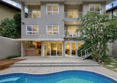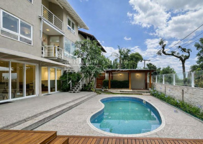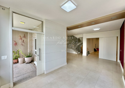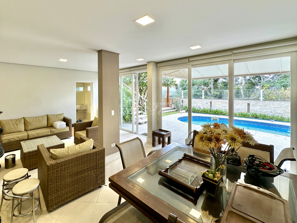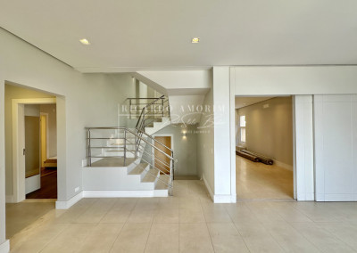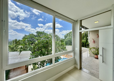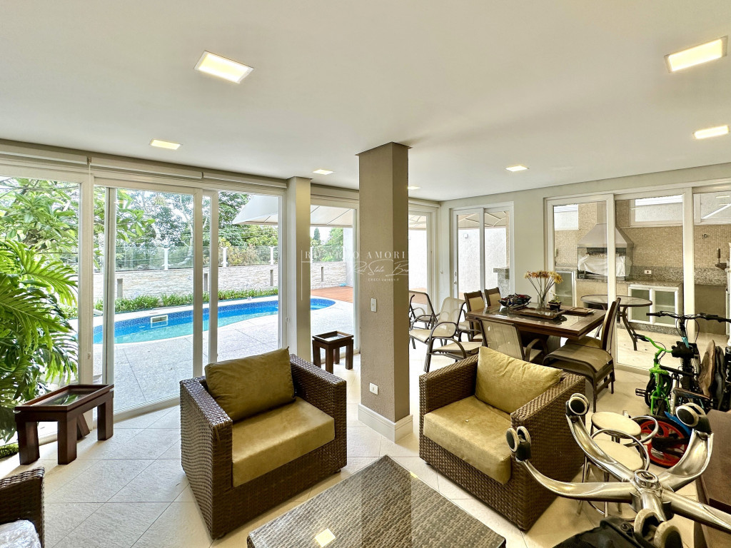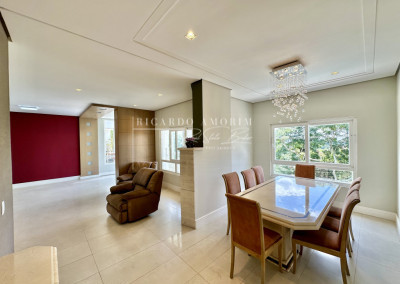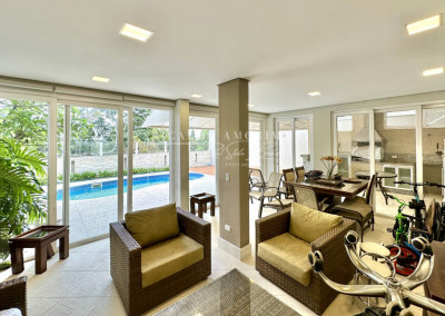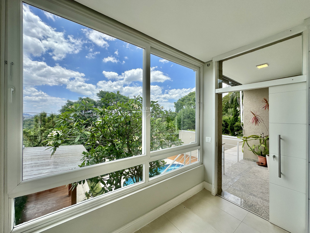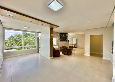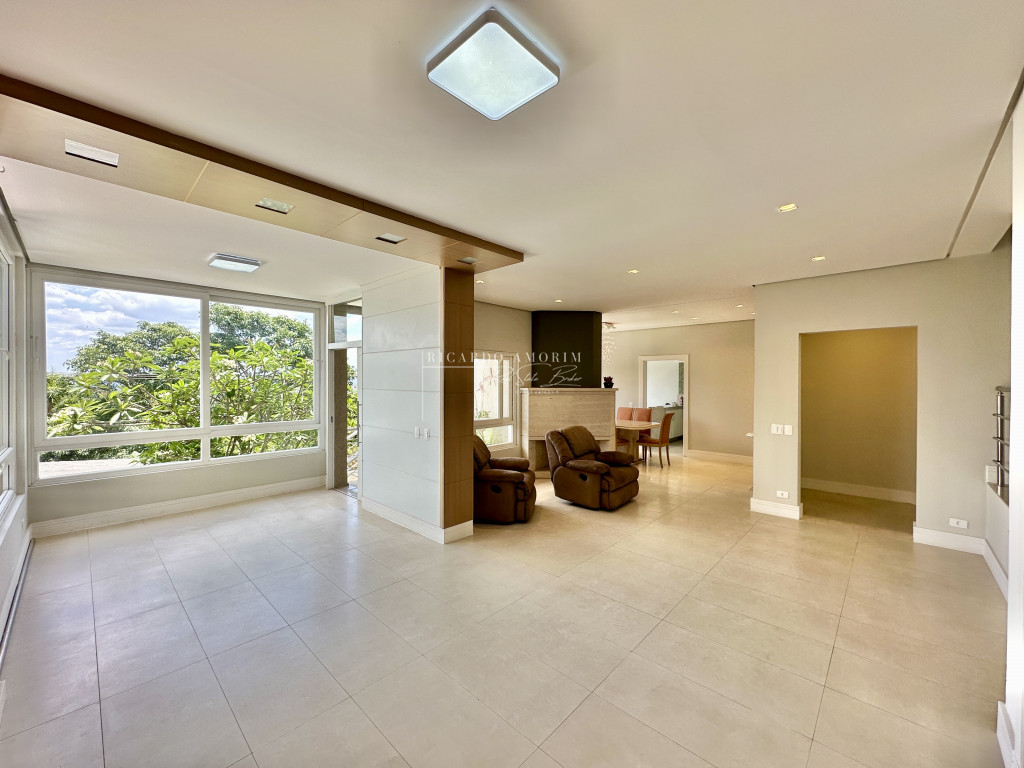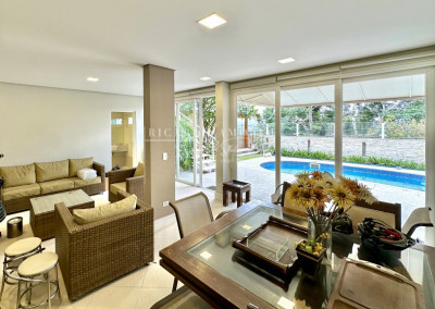 - Living amplo para 5 ambientes integrados, voltados para varanda com vista para o Vale da Fazendinha e piscina. Sala de jantar, sala de estar com lareira em travertino, sala de leitura, home theater /family room reservado, com porta de correr e vista para jardim de inverno.