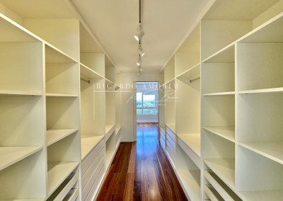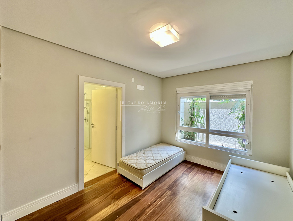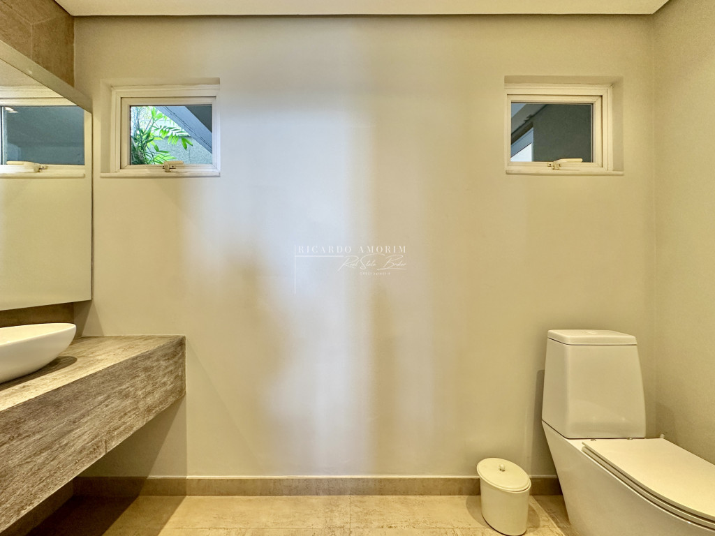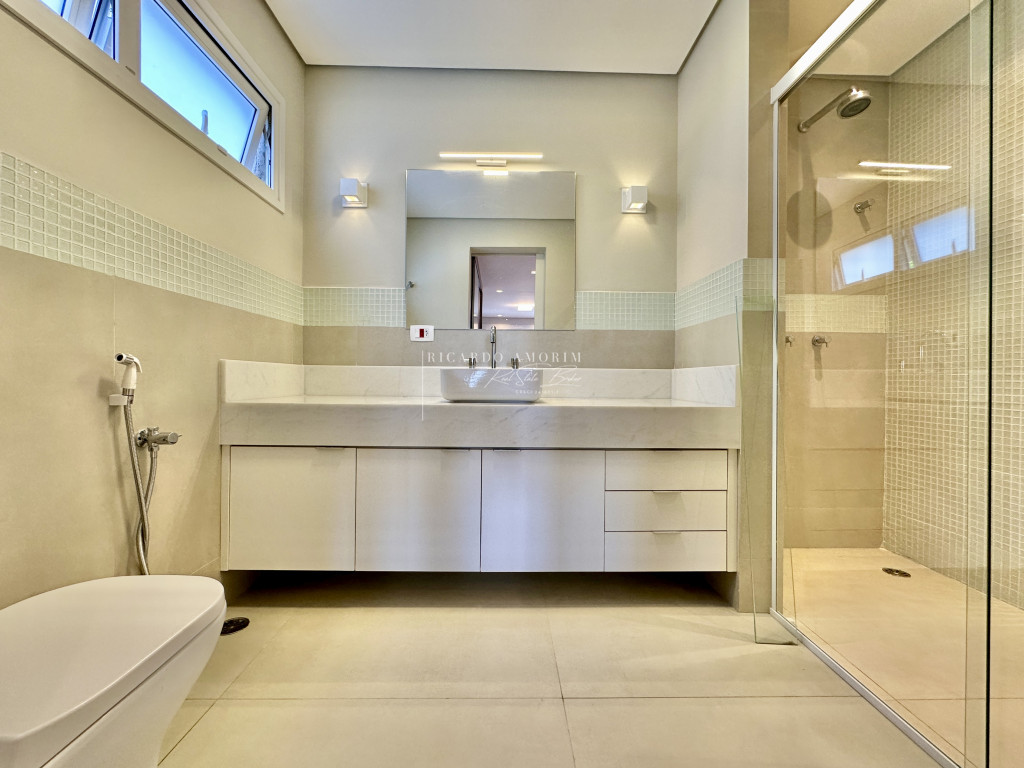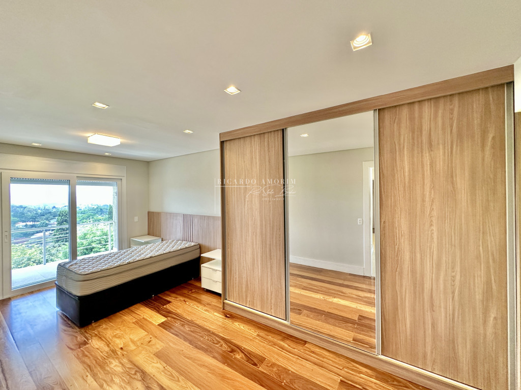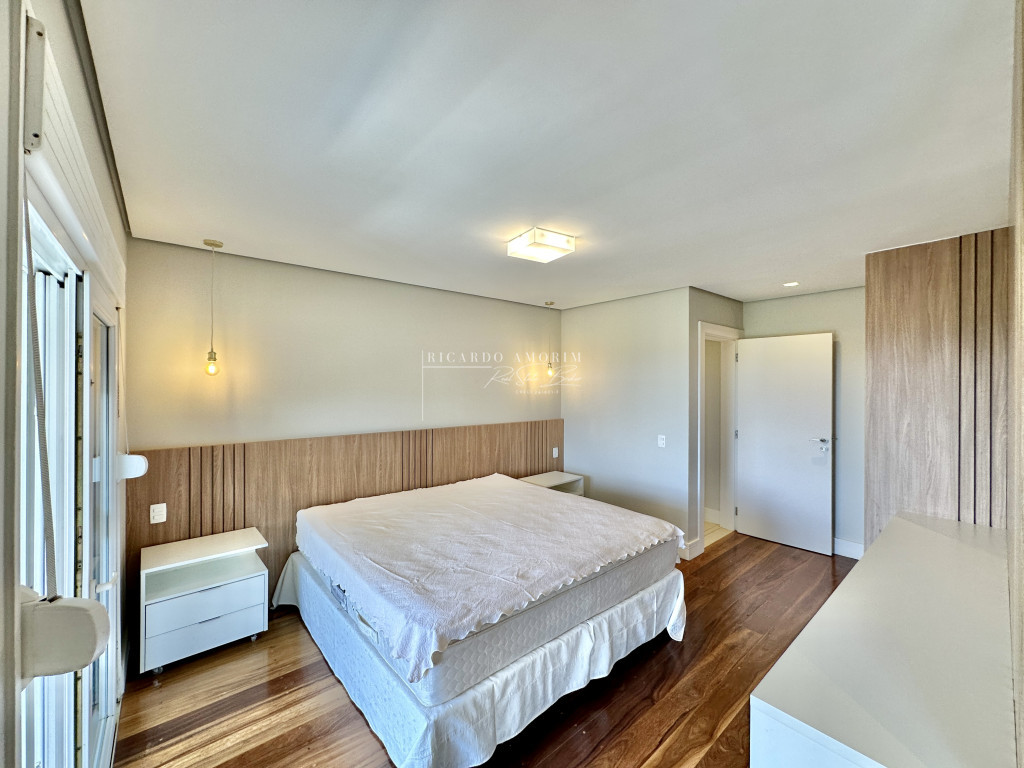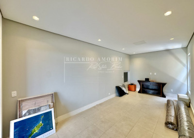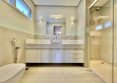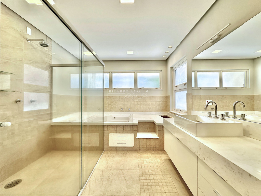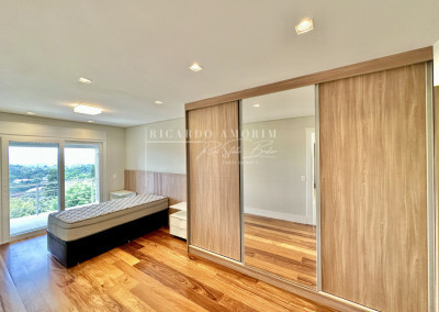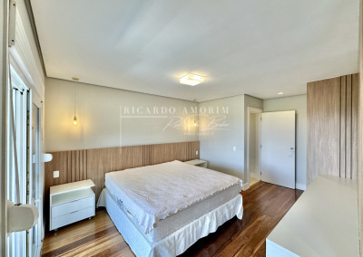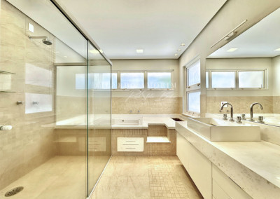 - Suíte master com ar-condicionado Q e F, saleta para TV com lareira em travertino preparada para gás, janela panorâmica, espaço para cama King Size, penteadeira, gaveteiros, criado mudos, Closet amplo para sr e sra com espelhos, porta de correr, nichos, sapateiras e armários. Banheiro com bancada de mármore branco com 2 cubas, 2 duchas, banheira hidromassagem dupla, vaso sanitário isolado e porta de vidro
