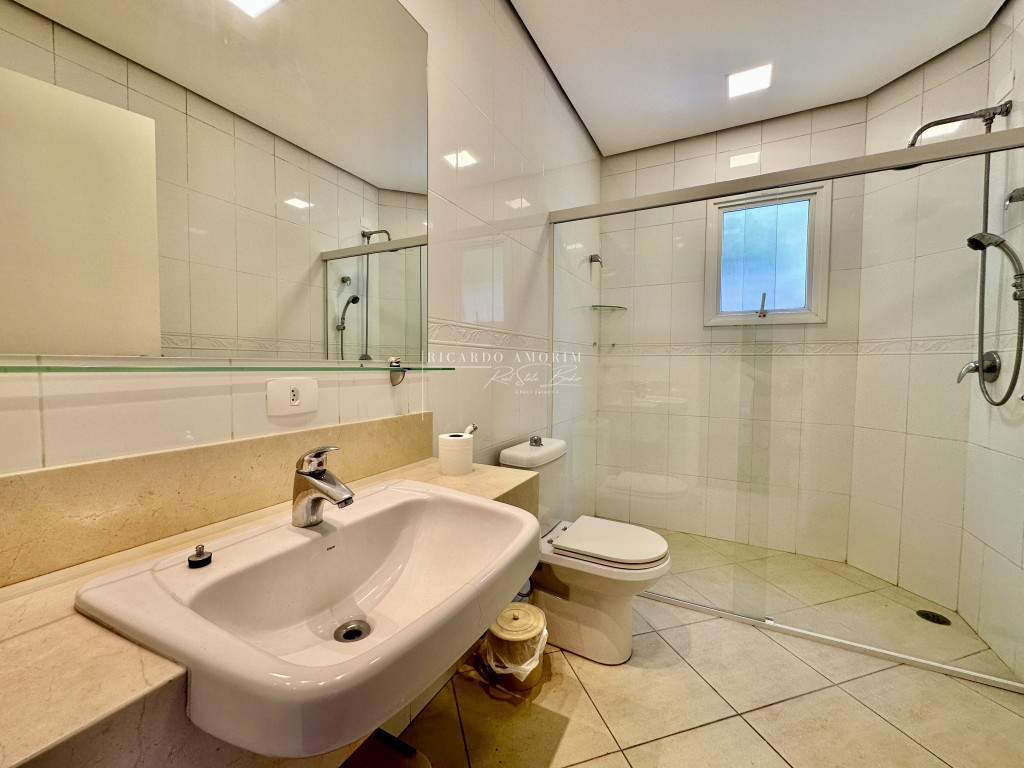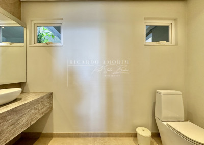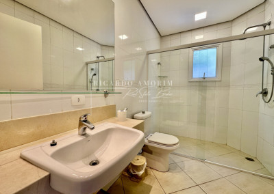 - Vestiário com tampo em mármore, chuveiro elétrico e box de vidro.
