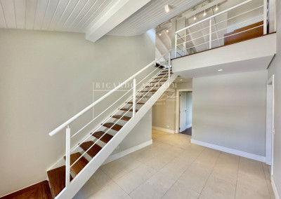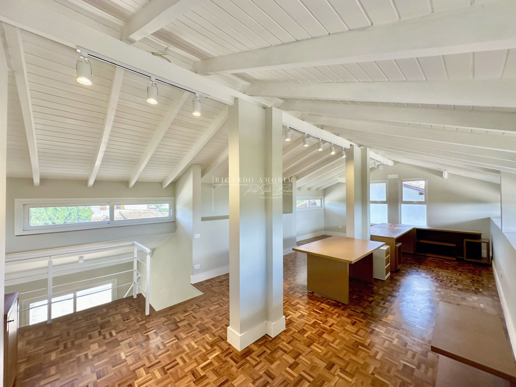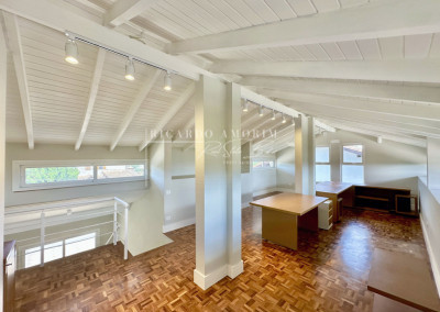 - Sótão com espaço multiuso de aproximadamente 68 m² c/ vista panorâmica, bastante iluminado e arejado. Piso de madeira, possui um lavabo e depósito técnico de serviço. Ideal para home office, estúdio, atelier, TV, jogos, música, brinquedoteca, academia e até dormitórios adicionais. O acesso é pelo hall intimo por escada de estrutura de ferro, revestida em madeira, com guarda corpo de metal