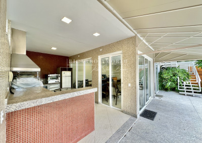 - Salão de Festas amplo Gourmet envidraçado e PVC com toldo, churrasqueira, forno de pizza elétrico, coifa, armários e gabinetes, bancadas e balcão em granito, cuba inox com 2 torneiras, espaço para fogão, geladeira e micro-ondas.
