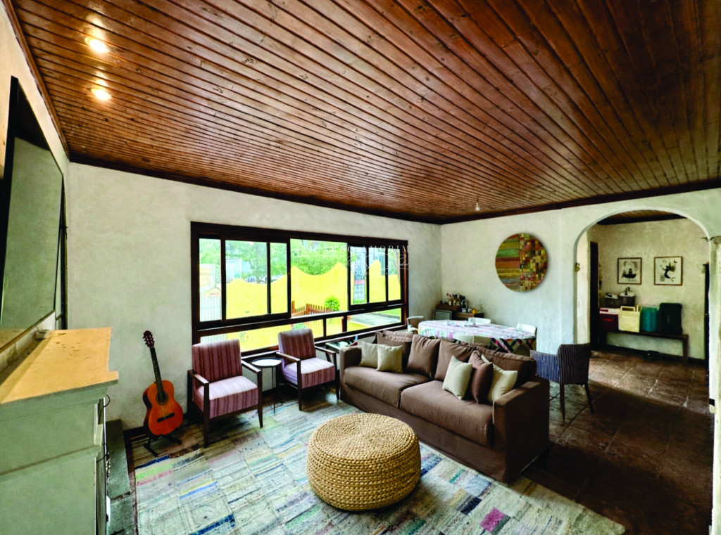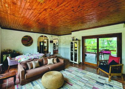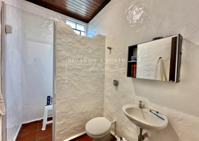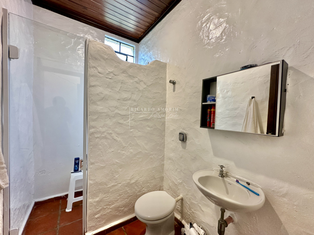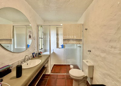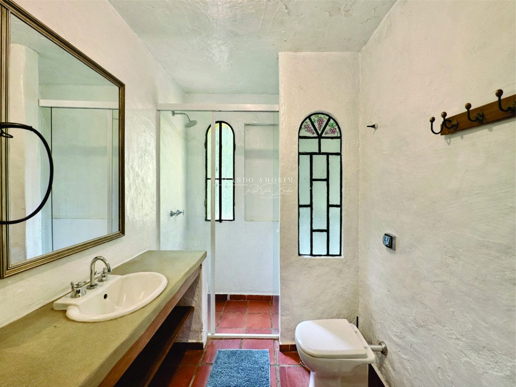 - Portas e janelas em madeira e vidro, com venezianas nos quartos.
