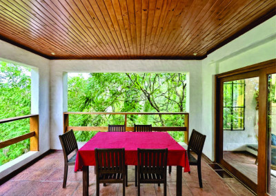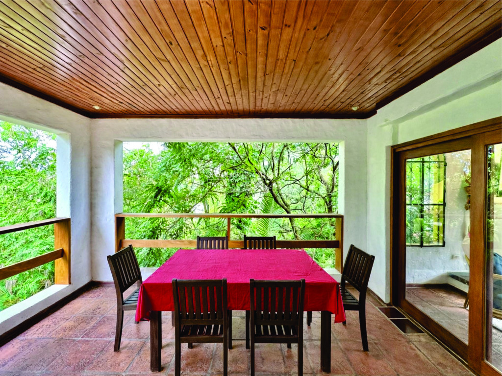 - Salão de Festas com acesso interno e externo, 3 portas balcão para varanda com ganchos de redes e vista para o jardim.