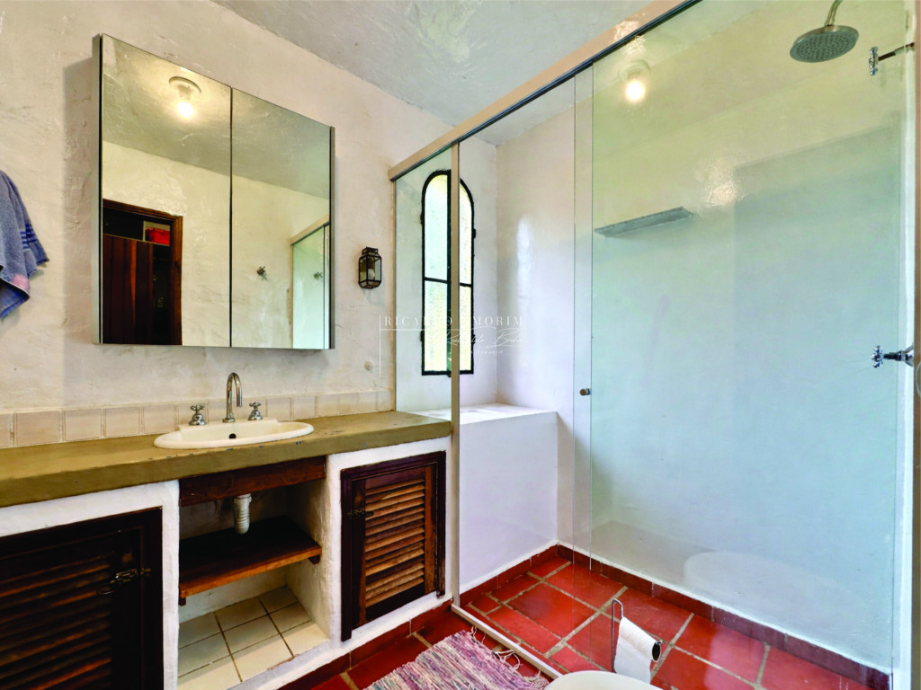 - Banheiros com tampos em concreto, espelhos, prateleiras, nichos, armários e box de vidro.