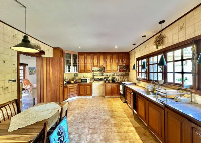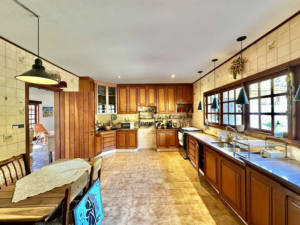 - Copa cozinha integrada à sala de jantar, repleta de armários planejados em madeira, com tampos em madeira e granito, gabinetes e bancadas com 2 cubas inox.