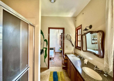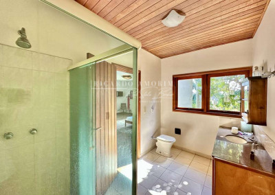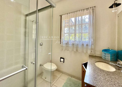 - Banheiros com tampos em granito, espelhos, gabinetes e box de vidro, 1 deles com lavatório externo e 2 cubas, sendo a master com vista para jardim.