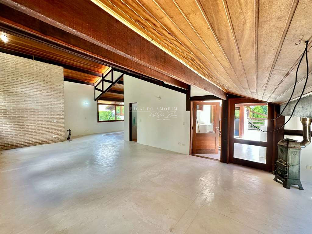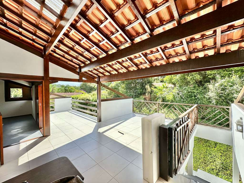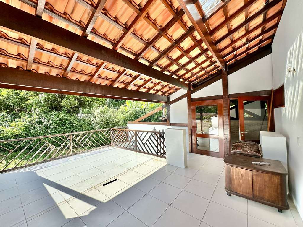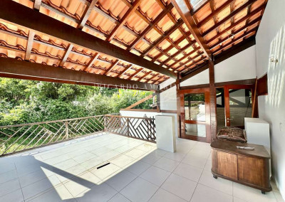 - Living em “L” envidraçado para 5 ambientes, voltado para varanda / terraço com guarda corpo de madeira e vista para natureza.