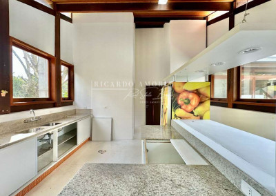 - Cozinha com bancada em granito, 2 cubas inox, ilha com balcão, gabinetes e despensa com prateleiras de pedra.