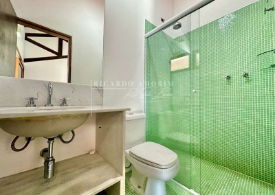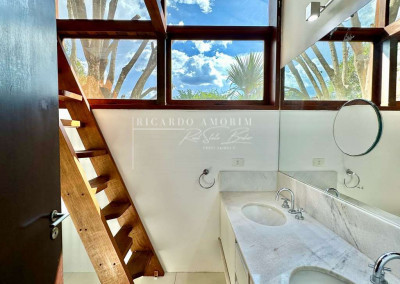 - Banheiros com tampos em mármore, espelho e box de vidro. Sendo a master com 2 cubas e hidro no mezanino do banheiro com vista.