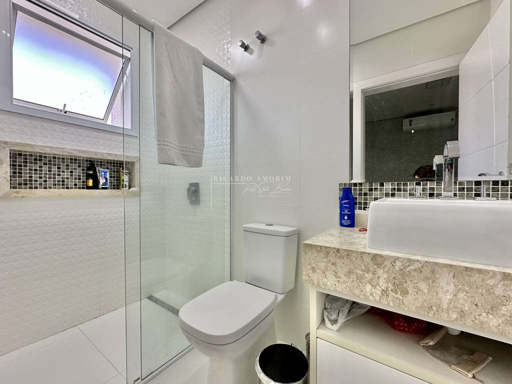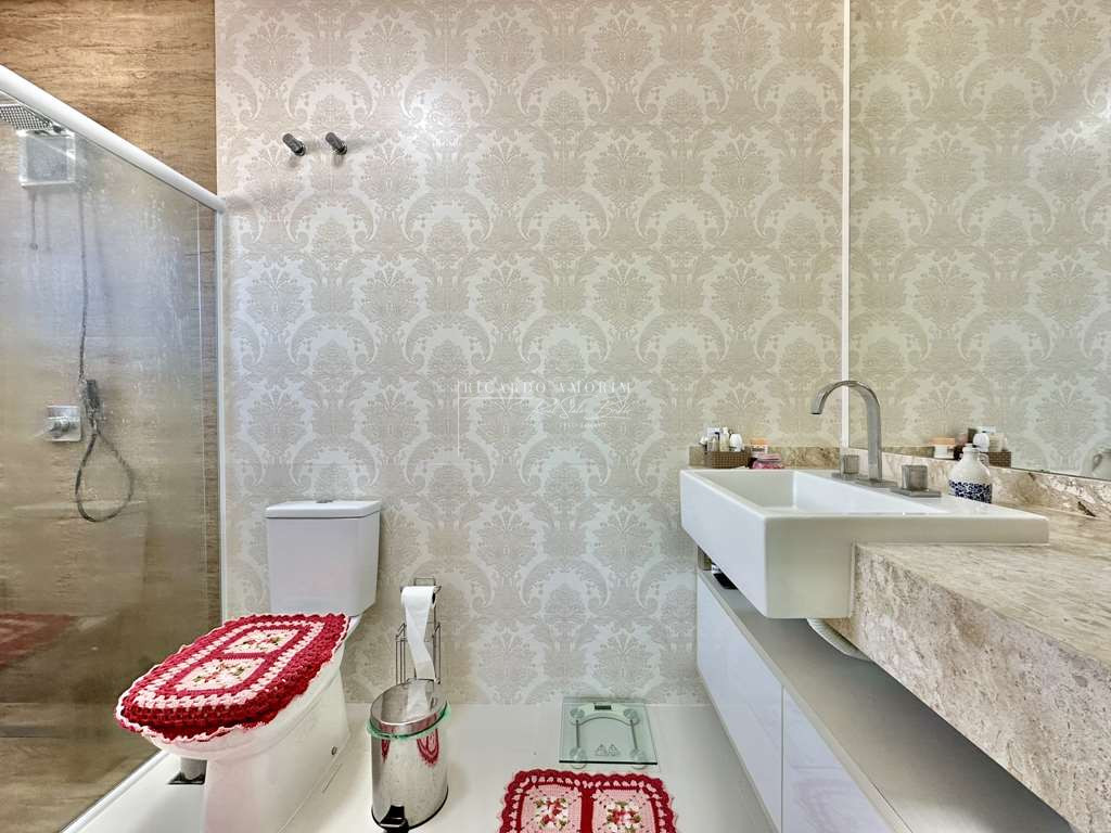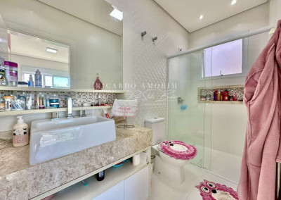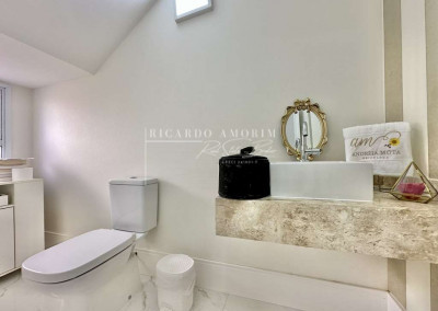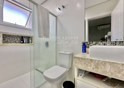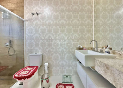 - Banheiros com tampos em mármore, espelhos, gabinetes, prateleiras, box de vidro, torneiras mono comado, nichos e ralos horizontais. Sendo a master integrado ao closet.
