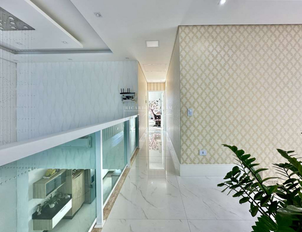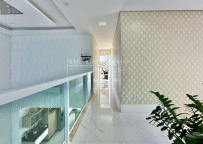 - Hall íntimo no piso superior com roupeiro e vista para o living.