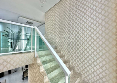 - Escada de alvenaria envidraçada revestida em Travertino, guarda corpo de vidro e metal.