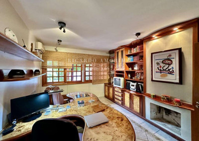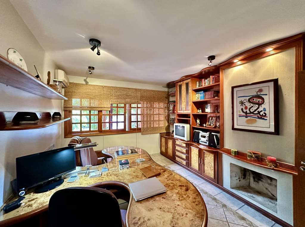 - Escritório repleto de armários, 2 estações de trabalho, lareira e ar-condicionado, voltado para a varanda e jardim.