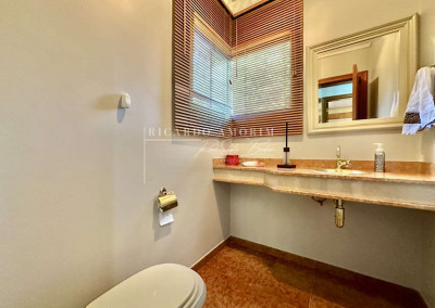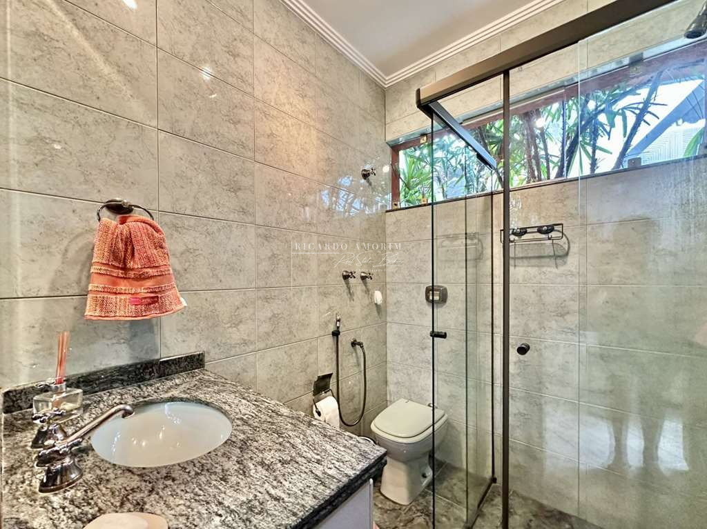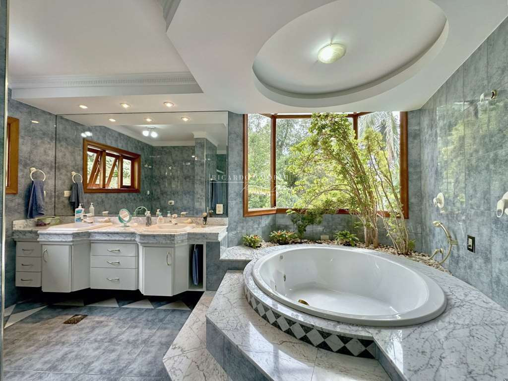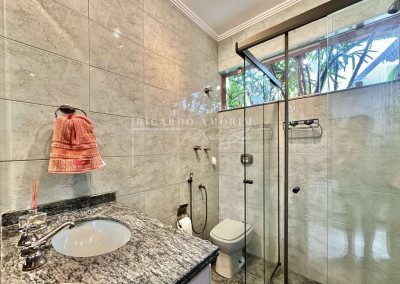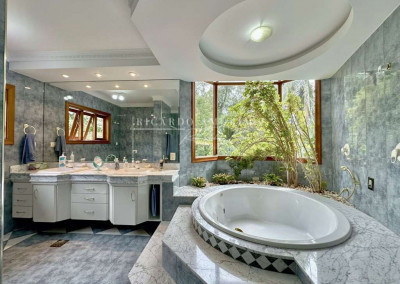 - Banheiros com tampos em granitos, espelho, gabinetes e box de vidro. Sendo a master uma sala de banho, com tampo em mármore, 2 cubas, 2 duchas e hidro redonda dupla.