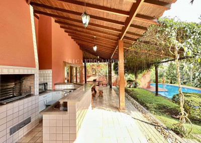 - Varanda gourmet integrada à piscina, com churrasqueira, forno de pizza, fogão à lenha, bancadas e balcão em granito, 2 cubas inox e gabinetes.
