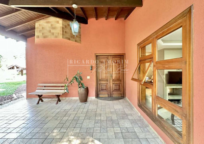- Entrada social por uma porta dupla imponente em madeira trabalhada.