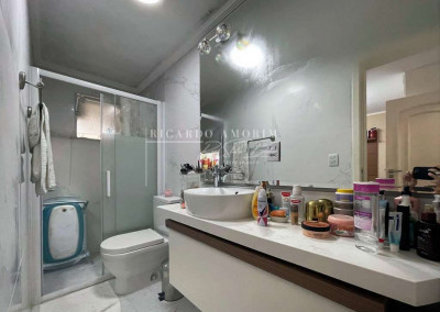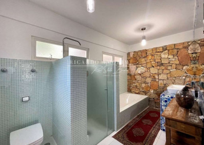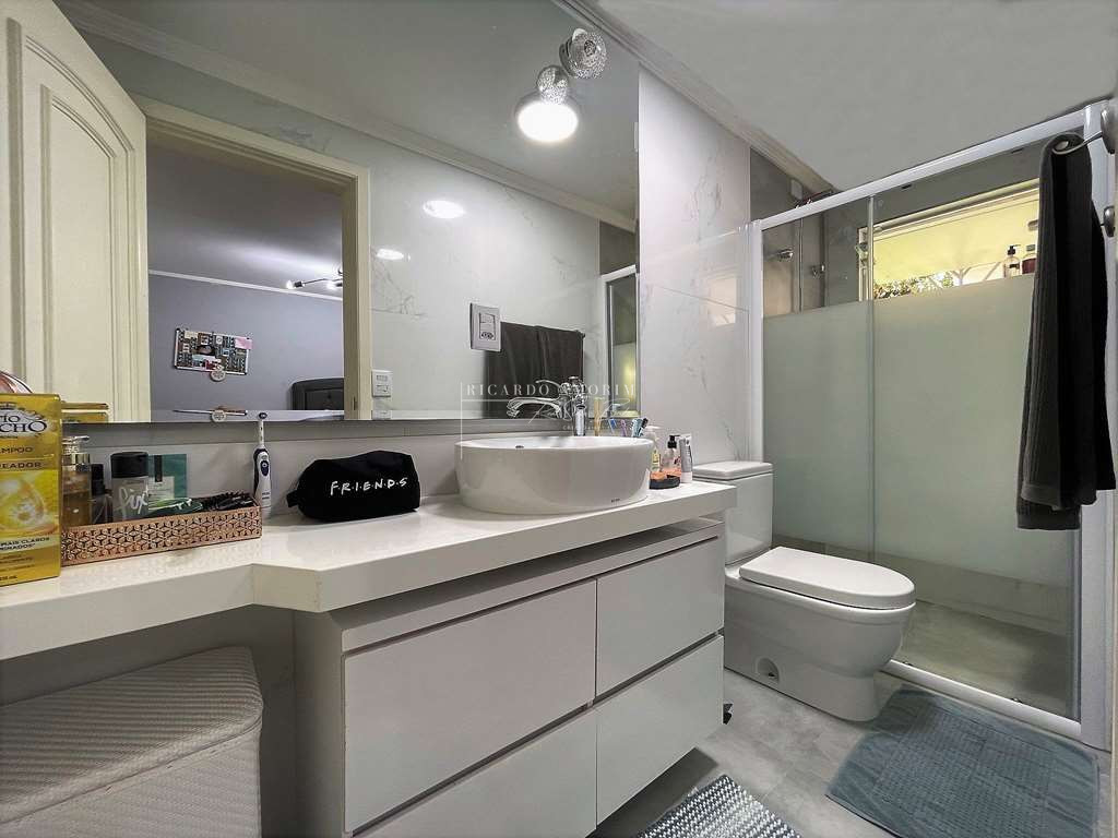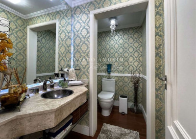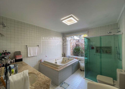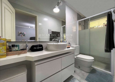 - Banheiros com espelhos, tampos em resina, gabinetes, box de vidro e nichos, sendo a máster com sala de banho, 2 cubas, hidro dupla panorâmica e jardim interno.