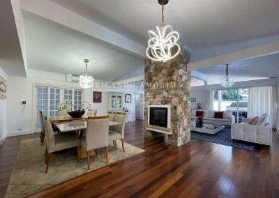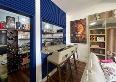 - Estar, lareira elétrica (para 2 ambientes), jantar (voltada para varanda gourmet 1) e family room com porta de correr, home theater, bar, espelho, balcão, pia e adega.