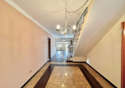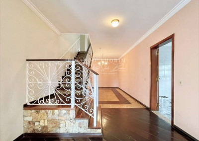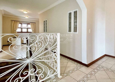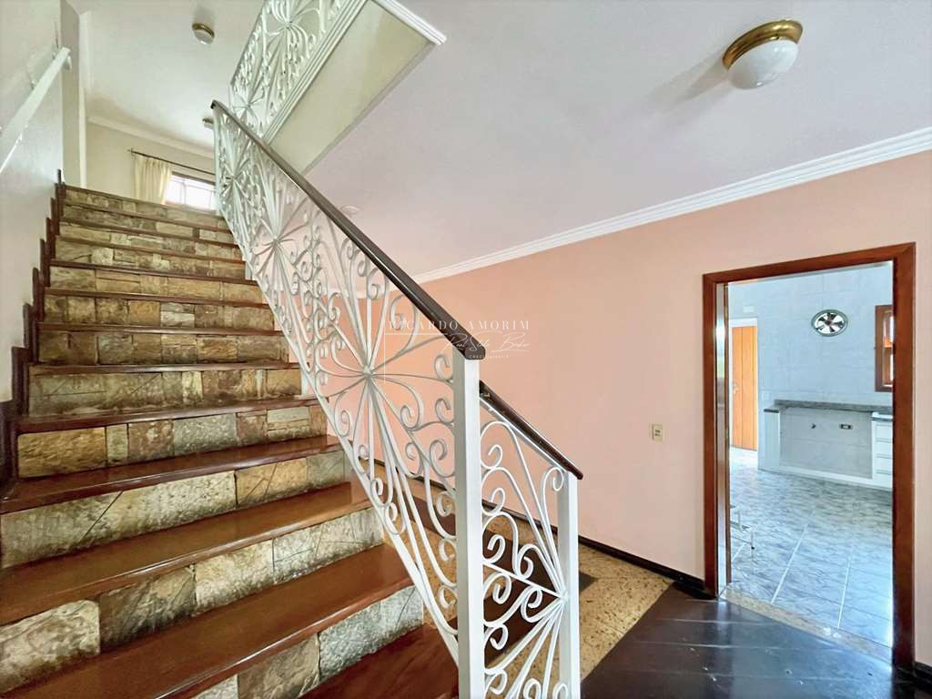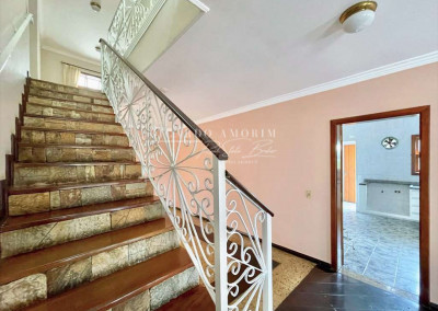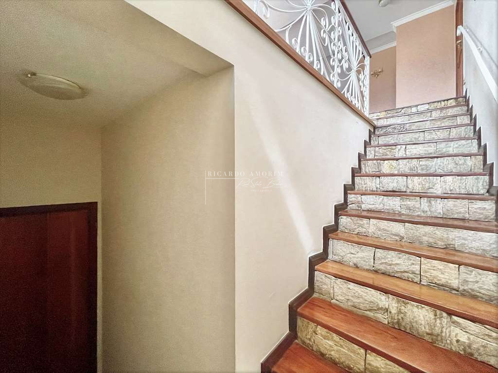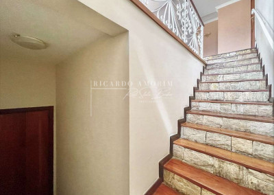 - Escadas internas com acabamento em pedra, degraus de madeira e guarda corpo em serralheria trabalhada.