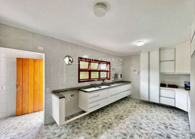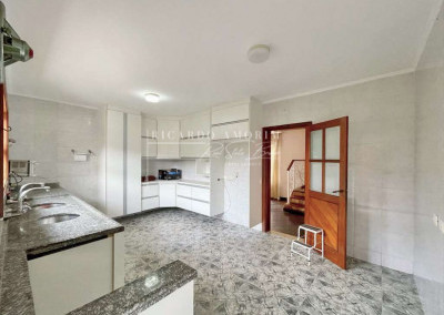 - Ampla cozinha com armários planejados e grande pia em granito com duas cubas.