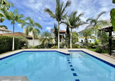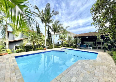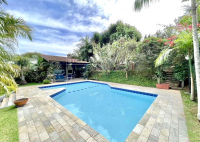 - Piscina de alvenaria 4m x 8m irregular, revestida em cerâmica, com escada interna, hidro e solarium.