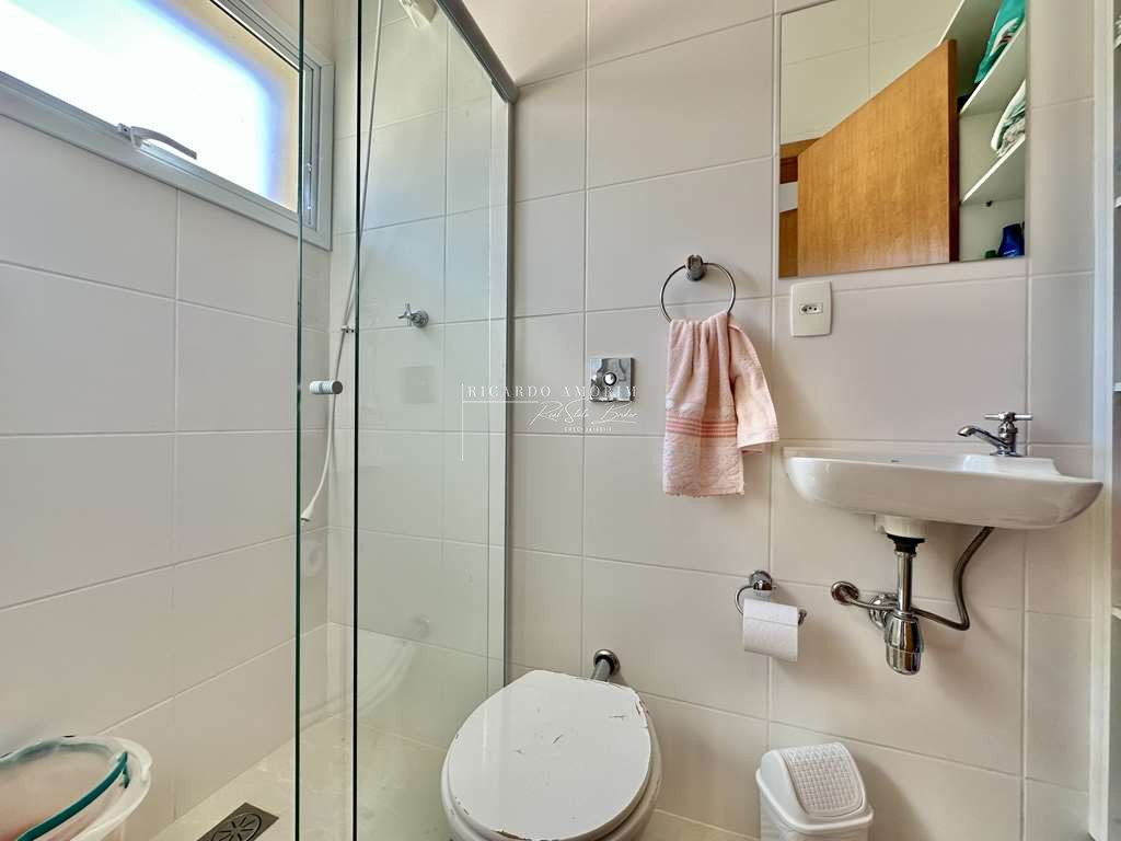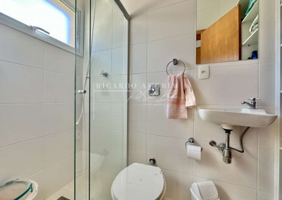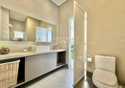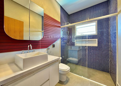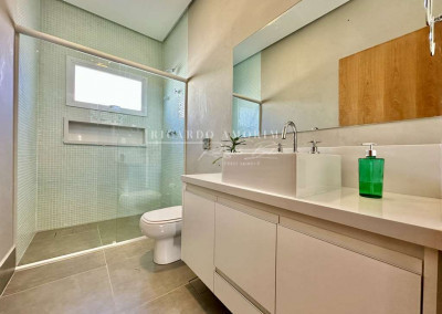 - Vestiário com tampo em granito, box de vidro e nicho.