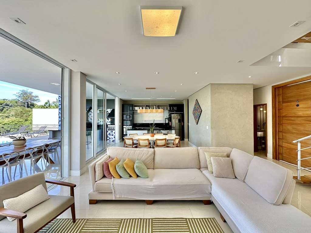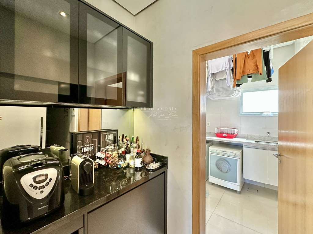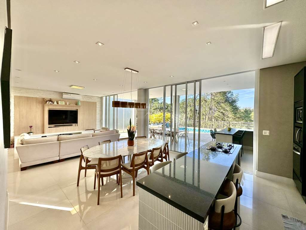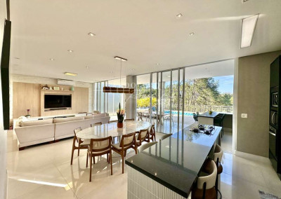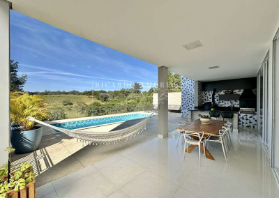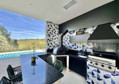 - Varanda Gourmet integrada, voltada para piscina, com privacidade e vista. Forno de pizza, churrasqueira a gás Cher Broil, coifa, bancada, balcão em granito, cuba inox, torneira gourmet e gabinetes. Espaço para rede, estar e refeições com mesa para 8 acentos.