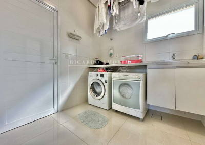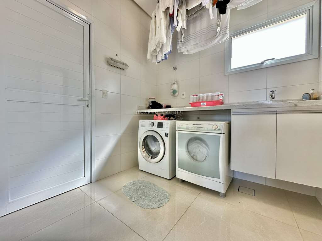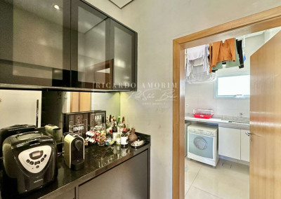 - Área de serviço aberta ensolarada com acesso externo e lavanderia fechada integrada à cozinha, com tanque inox, tampo em mármore, gabinete, banheiro de serviço com armarinho, box de vidro e chuveiro elétrico.