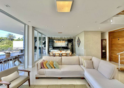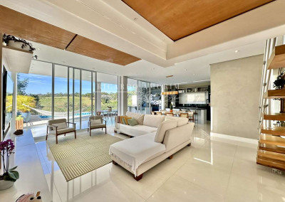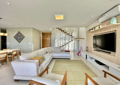 - Living para 6 ambientes integrados, com ar-condicionado Q e F e uma parede em canjiquinha, voltado para varanda Gourmet