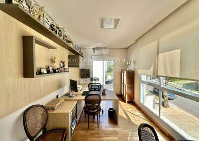 - Escritório planejado com porta de correr, ar-condicionado Q e F, mesa de reunião, estação de trabalho completa com armários, estantes, gaveteiros, gabinetes e espaço para terraço.