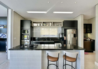 - Cozinha planejada com despensa, prateleiras e porta de correr, bancada em granito, 2 cubas inox com 2 torneiras, balcão para 4 bancos, bancadas e gabinetes. Fogão Brastemp Ative 5 bocas cook top e forno Brastemp.