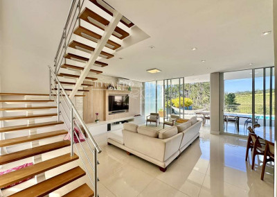 - Estar, lareira gás, TV, jantar, bar/café e cozinha.