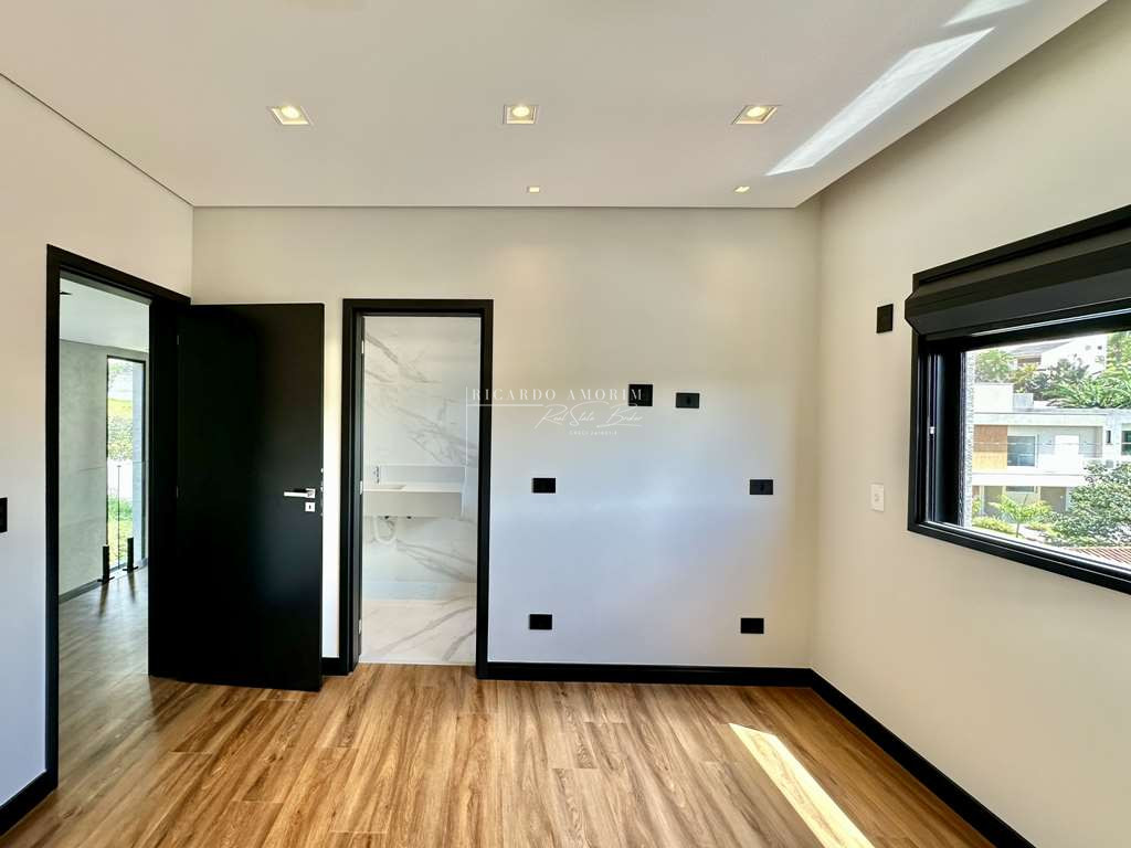 - Portas e janelas em alumínio preto e vidro, com persianas elétricas nos quartos.