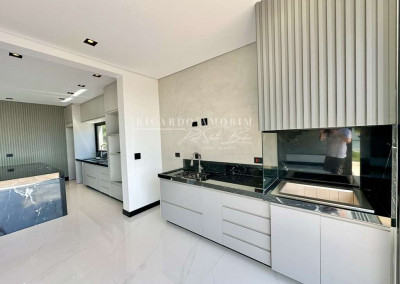 - Cozinha planejada com bancada, ilha, balcão, armários, gabinetes, 2 cubas inox e torneira gourmet.
