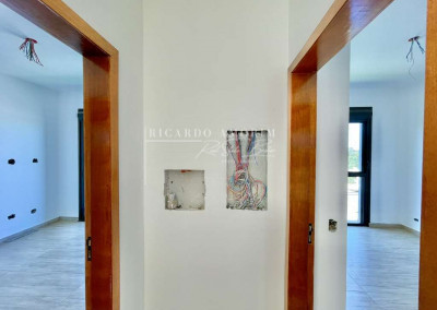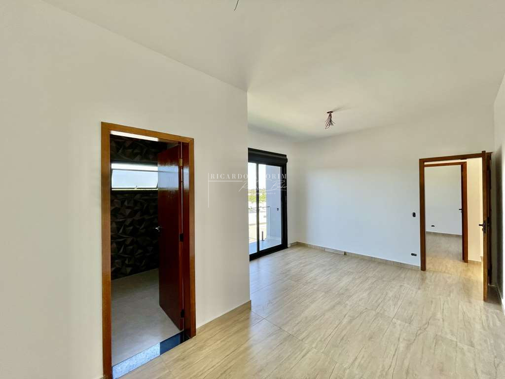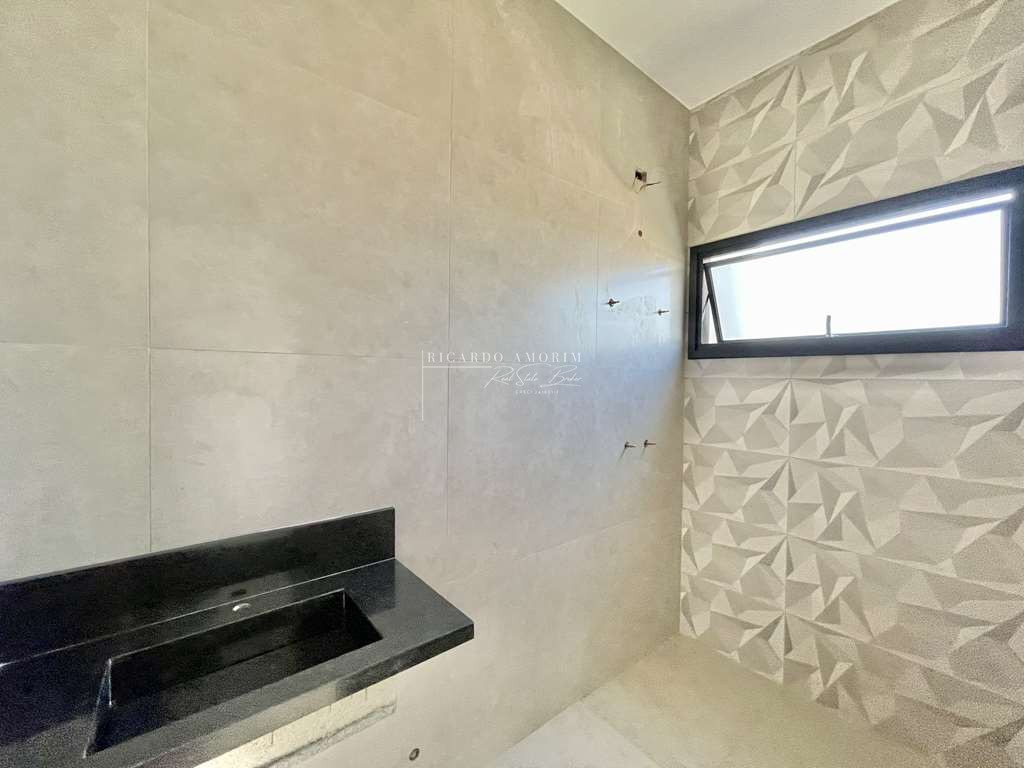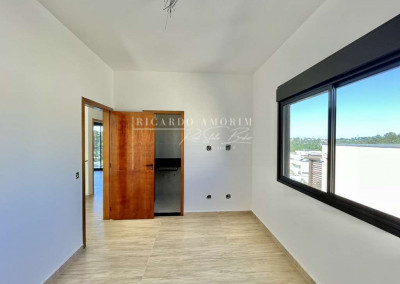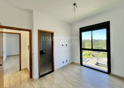 - Portas e janelas em alumínio preto e vidro com persianas nos quartos.