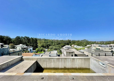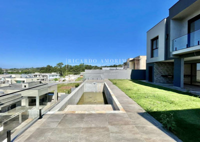 - Piscina 6 m x 3 m com borda infinita, iluminada, revestida em vinil, com prainha, hidro, ducha e casa de máquinas.