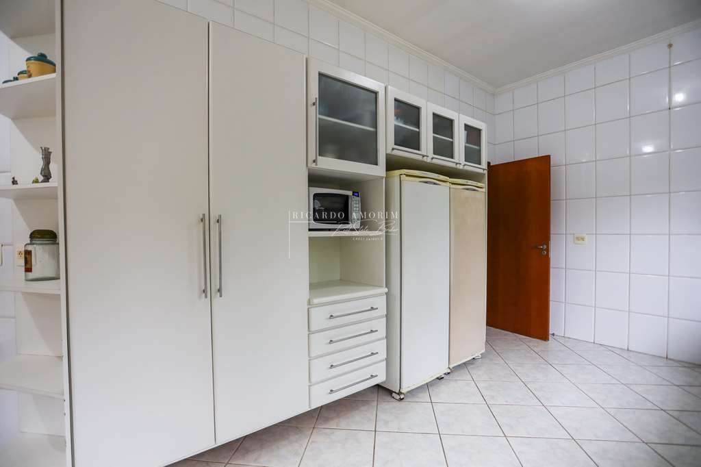 - Cozinha ampla repleta de armários planejados, com sala de almoço, bancada em granito, duas cubas e gabinetes.