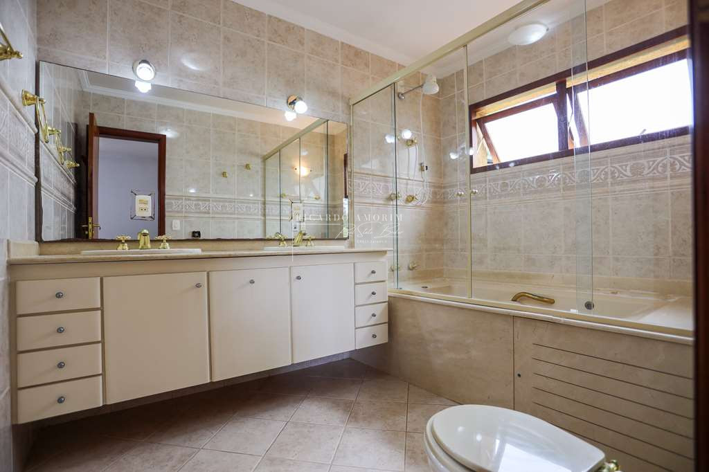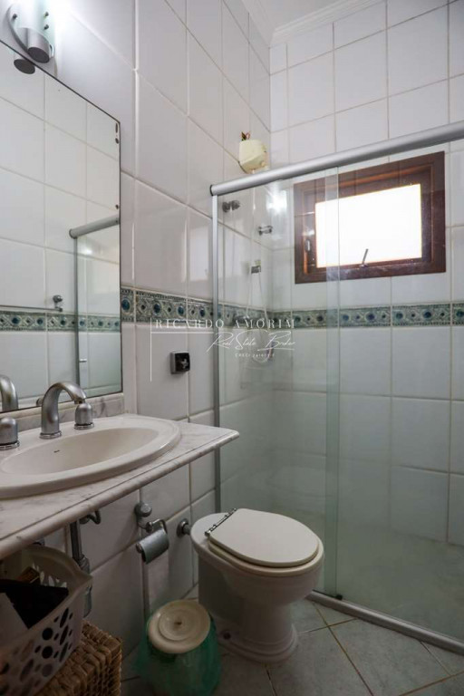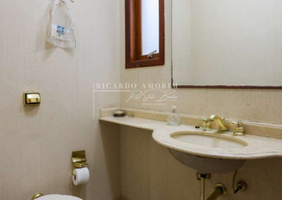 - Lavabo e banheiro da suíte principal com tampo em mármore.