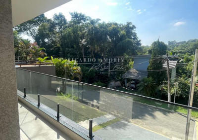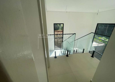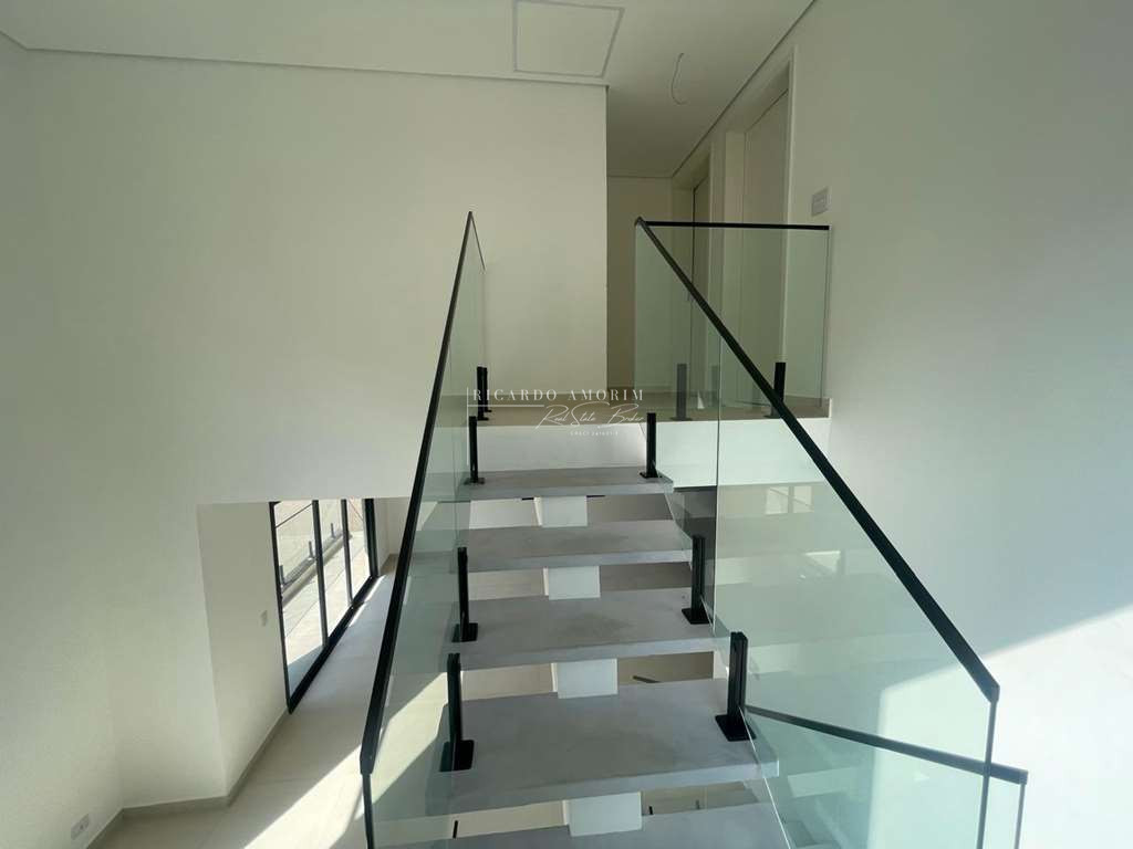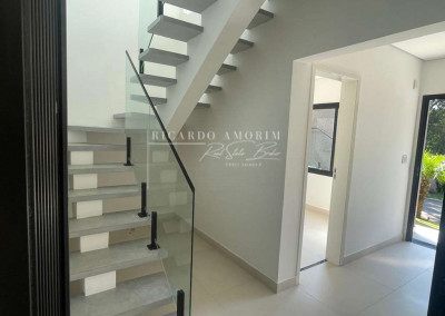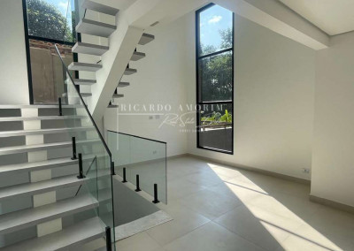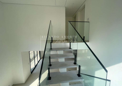 - Escadas e terraços de alvenaria, revestidos em porcelanato, com guarda-corpos em vidro temperado e metal.