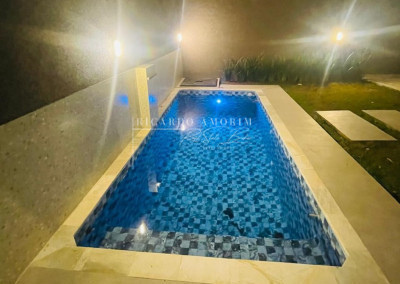 - Piscina com 9m², iluminada, revestida em vinil, com cascata, ducha, solarium e casa de máquinas.