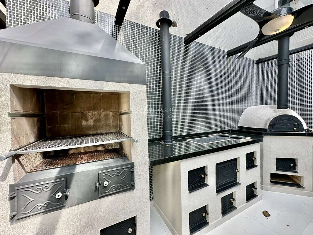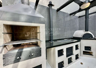 - Anexo gourmet completo envidraçado integrado à varanda, cozinha e piscina, com ventilador de teto, churrasqueira, coifa, forno de pizza, fogão à lenha, bancadas em granito, balcão, pia inox com torneira gourmet.