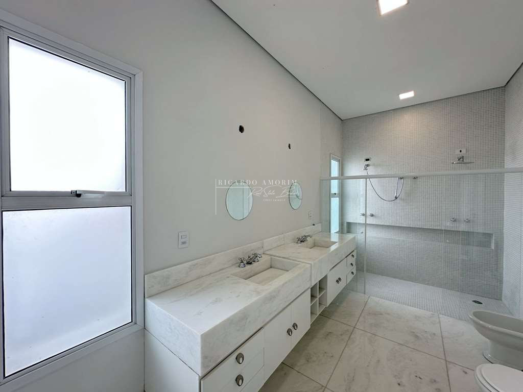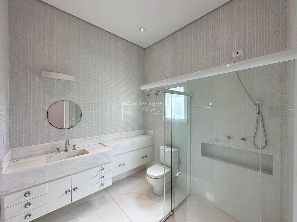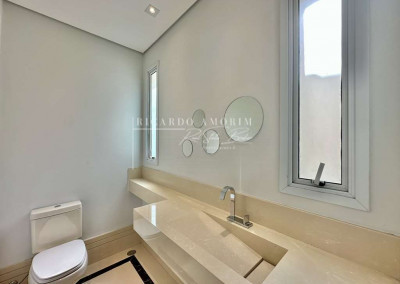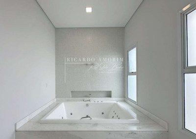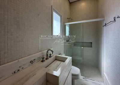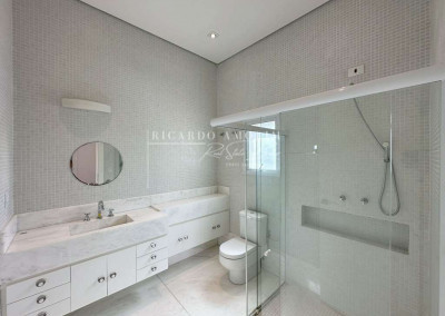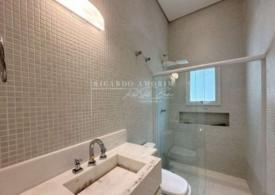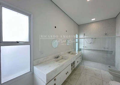 - Banheiros com pisos e tampos em mármore, gabinetes, box de vidro, nichos, paredes em pastilhas, sendo a suíte master com 2 cubas, 2 duchas e hidro dupla.
