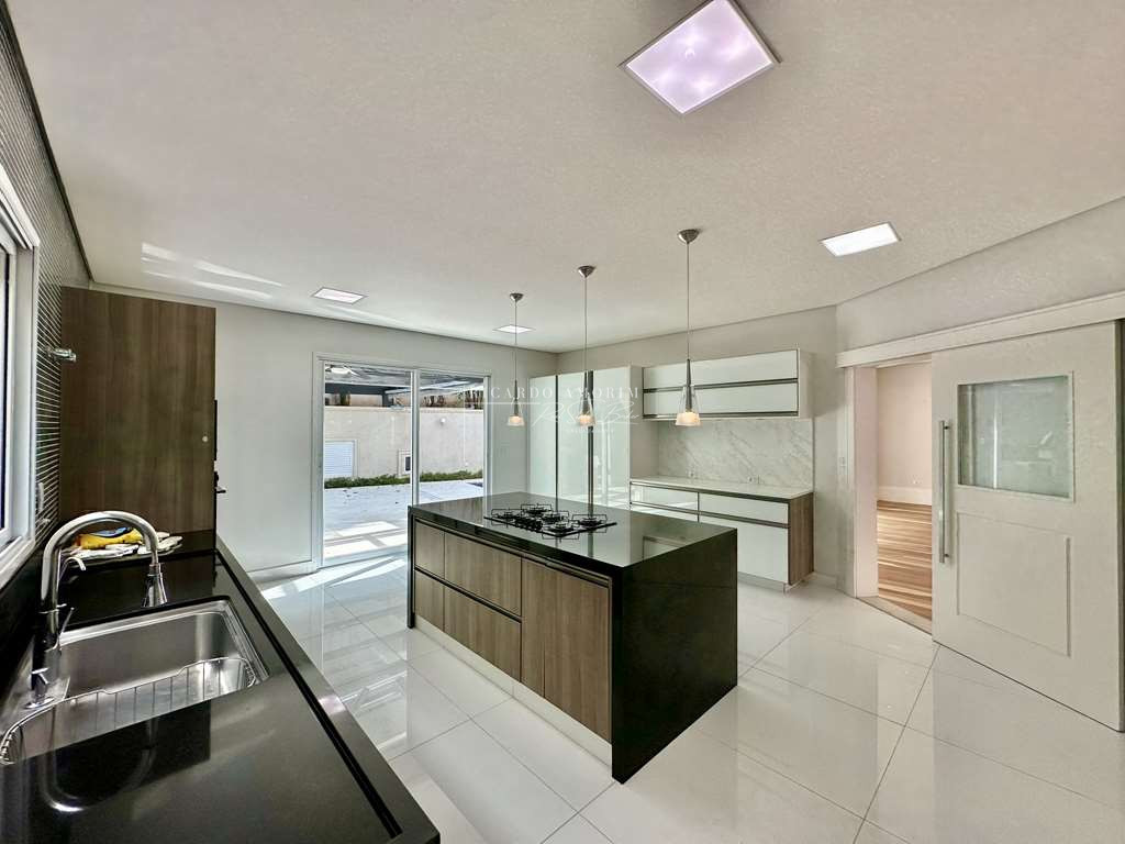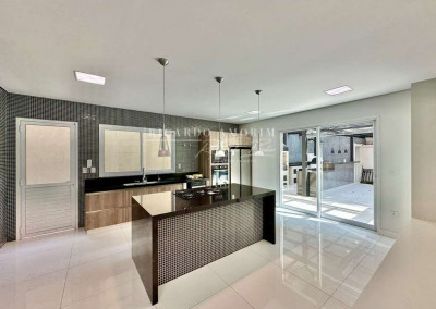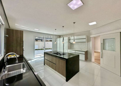 - Cozinha planejada com porta de correr e despensa, integrada ao anexo gourmet, varanda e piscina, com bancadas em granito, cuba inox, torneira gourmet, ilha com balcão, gabinetes e fogão 5 bocas cook top Mondial, lava louças Brastemp 10 serviços, micro-ondas e forno Electrolux.