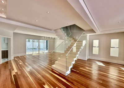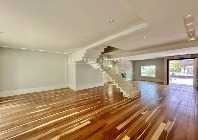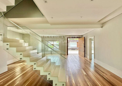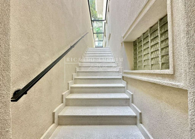 - Escada de alvenaria iluminada, revestida em mármore, com guarda corpo de vidro.