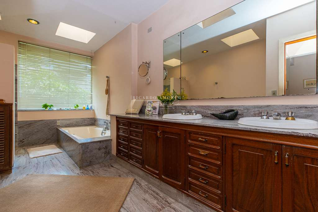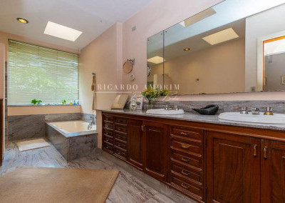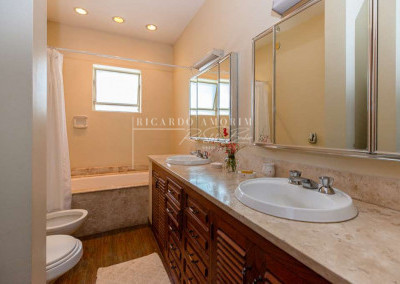 - Banheiros com espelho tampos em mármore, box de vidro e bidê, das suítes americanas com 2 cubas e 1 com banheira. A máster 1 com 2 cubas e hidro panorâmica.