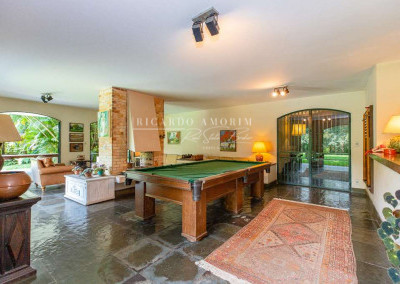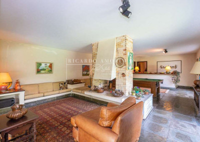 - SALÃO MULTIUSO COMPLETO integrado ao jardim. Ideal para festas, jogos e música. Com varanda, lareira dupla face, 3 sofás de alvenaria, bar, balcão, armários de madeira e copa com bancada e pia inox, adega e despensa.